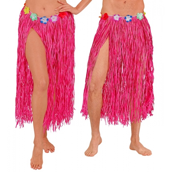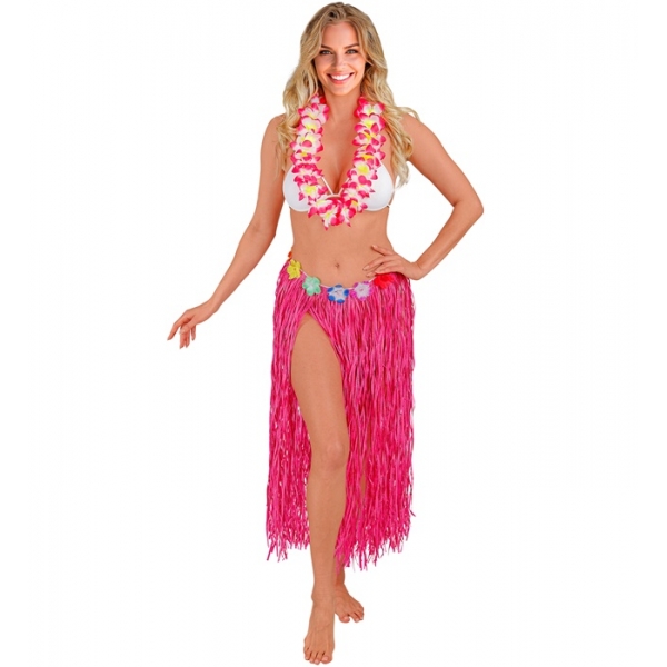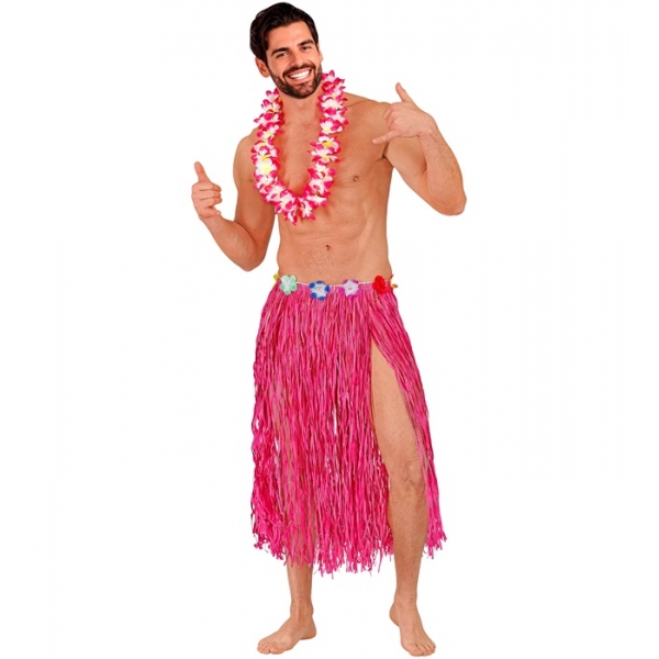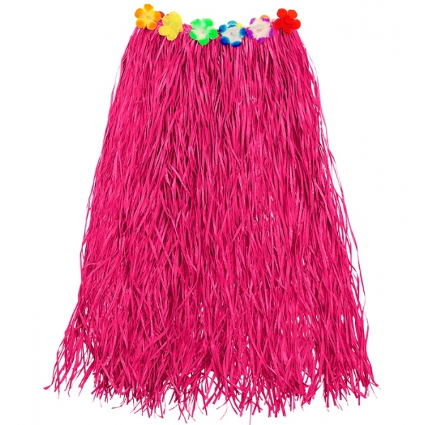 Koši rozā Hula svārki ar ziedu jostu. Regulējams izmērs, garums 80 cm. Lieliska izvēle ballītēm un dejām.