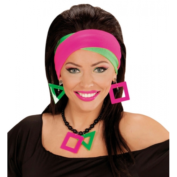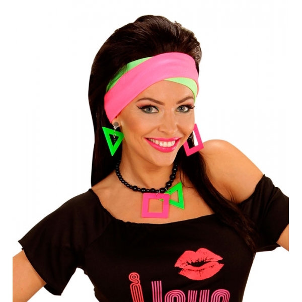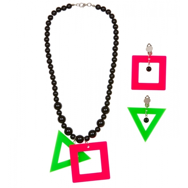 Košs neona kaklarotas un auskaru komplekts, lieliski piemērots 80. gadu ballītēm un kostīmiem.
