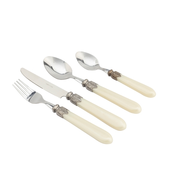 Metāla vintage galda piederumi ar perlamutra krēmkrāsas rokturi, komplekts 4 priekšmeti.