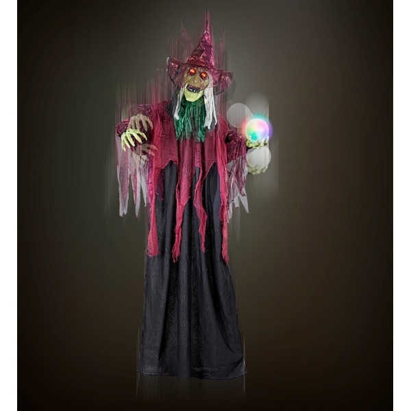 Animēta dekorācija Helovīnam "Ragana", uzstādīta uz statīva (iekļauts komplektā), runājoša un smejoša. Ragana groza galvu, mirgo ar acīm un rokās tur dažādās krāsās spīdošu bumbu. Augstums 170 cm.