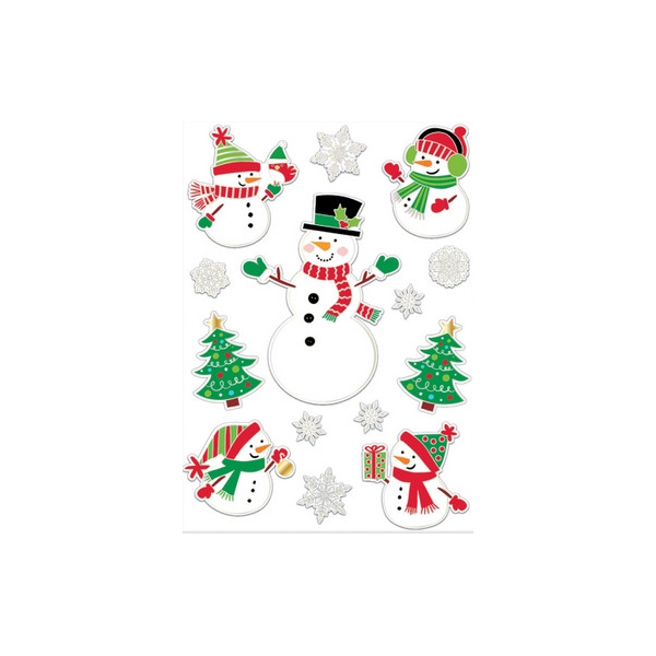 Vinila uzlimju komplekts ar sniegavīriem, eglītēm, dāvanām un sniegpārsliņām logu dekorēšanai. 14 gab. Izmērs: 3-20 cm.