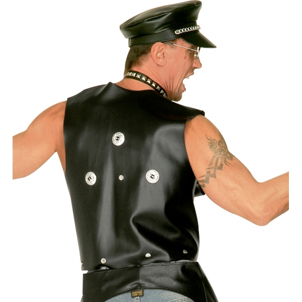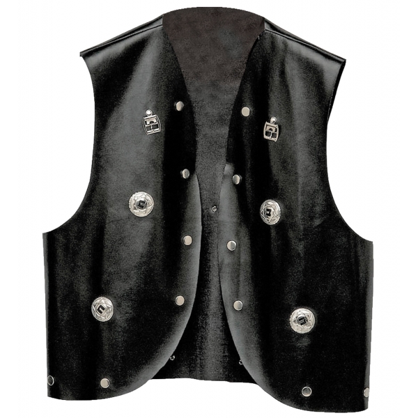 Melna mākslīgas ādas veste ar metāla kniedēm. Stilīgs aksesuārs bikeru vai rokeru tēlam, piemērots ballītēm, Helovīnam un fotosesijām. Ērta un izteiksmīga detaļa.