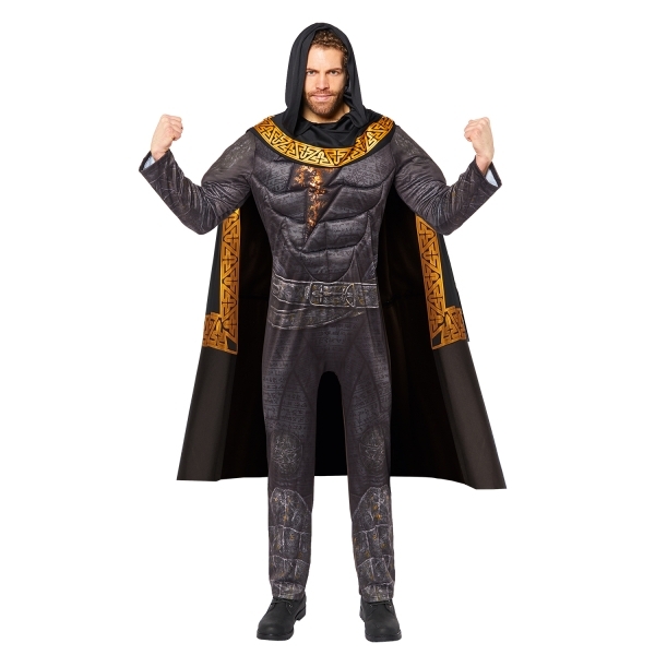 Iespaidīgs “Black Adam” kostīms ar polsterētu kombinezonu un kapučjaku ar zelta detaļām. Piemērots cosplay un Helovīnam.