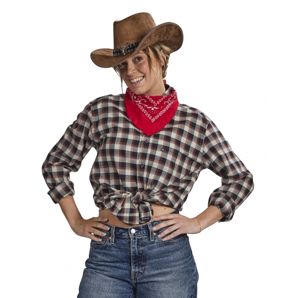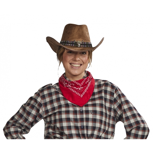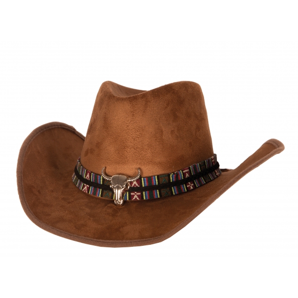 Zamšāda brūna kovboju cepure ar dekoratīviem elementiem.