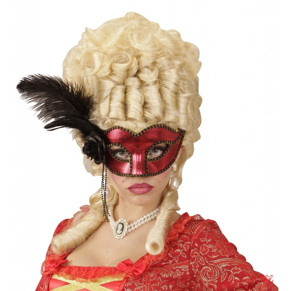 Venēcijas acu maska sarkanā krāsā ar rozēm, krellēm un spalvām