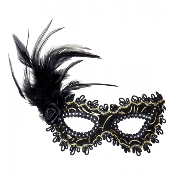 Melna karnevāla maska ar dekoratīvu rozi, spalvām un zelta akcentiem.