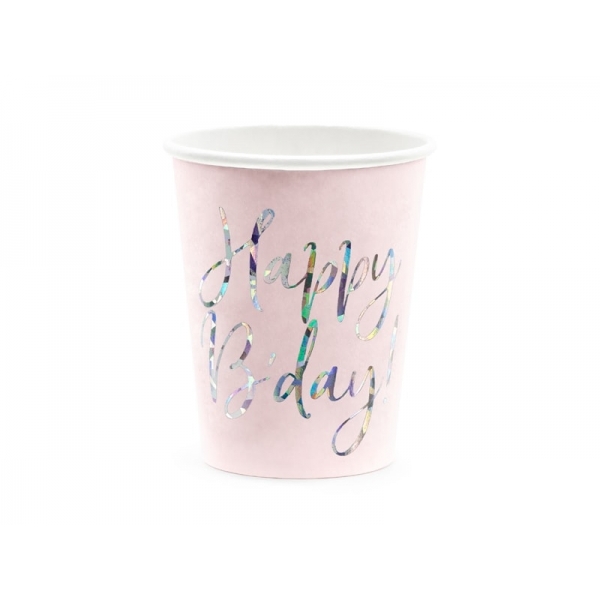 Papīra glāzes Happy Birthday, gaiši rozā, 220 ml., 6 gab. — svētku dekorēšanai, galda noformēšanai un ballītēm