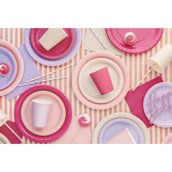 Papīra šķīvji, gaiši rozā, 23 cm., 6 gab. — svētku dekorēšanai, galda noformēšanai un ballītēm. Piemērots dzimšanas dienām, ballītēm un pasākumiem. Kvalitatīva prece: pieejama veikalā un iespējama piegāde.