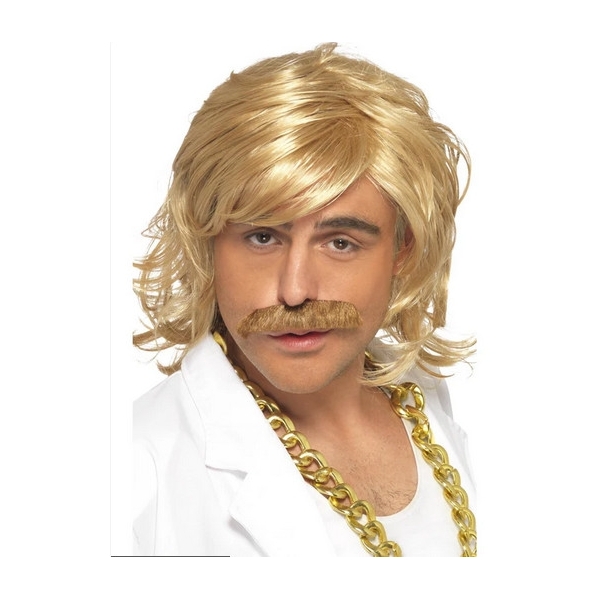 Komplekts Blondīna parūka un ūsas, retro varoņa stilā no 70.–80. gadiem.