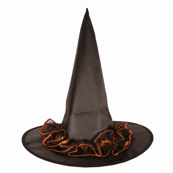 Melna raganas cepure ar oranžu organzas lenti un fliteriem