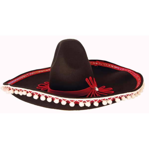 Melna krāsas Sombrero cepure, rotāta ar spilgtu sarkanu apmali un mini-pomponiem.