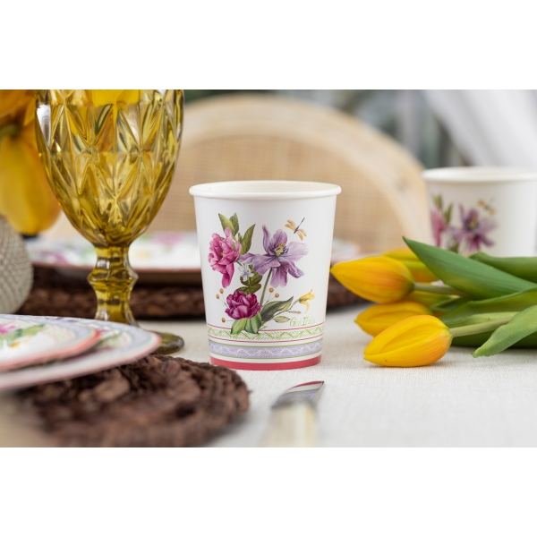8 apaļi papīra šķīvji 27 cm ar spilgtu ziedu ornamentu violetos un purpursarkanos toņos