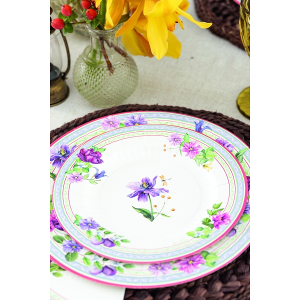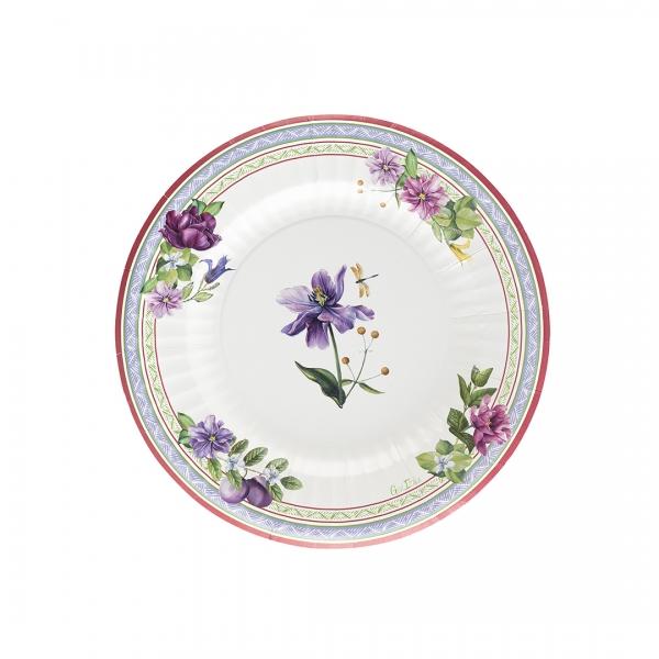 8 apaļi papīra šķīvji 21 cm ar spilgtu ziedu ornamentu violetos un purpursarkanos toņos