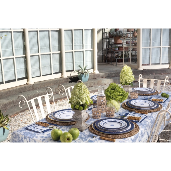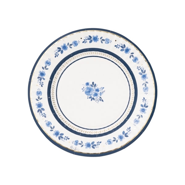 8 papīra šķīvji 21 cm ar klasisku zilo ziedu rakstu un zelta malu.