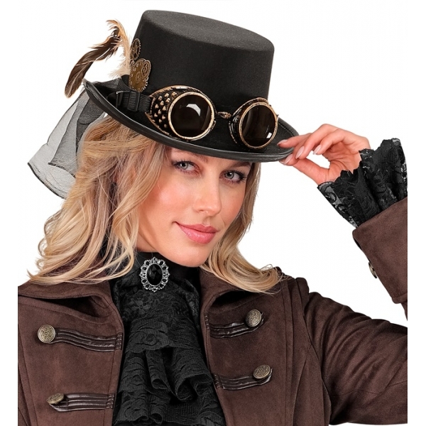 Steampunk cilindrs ar brillēm un spalvu